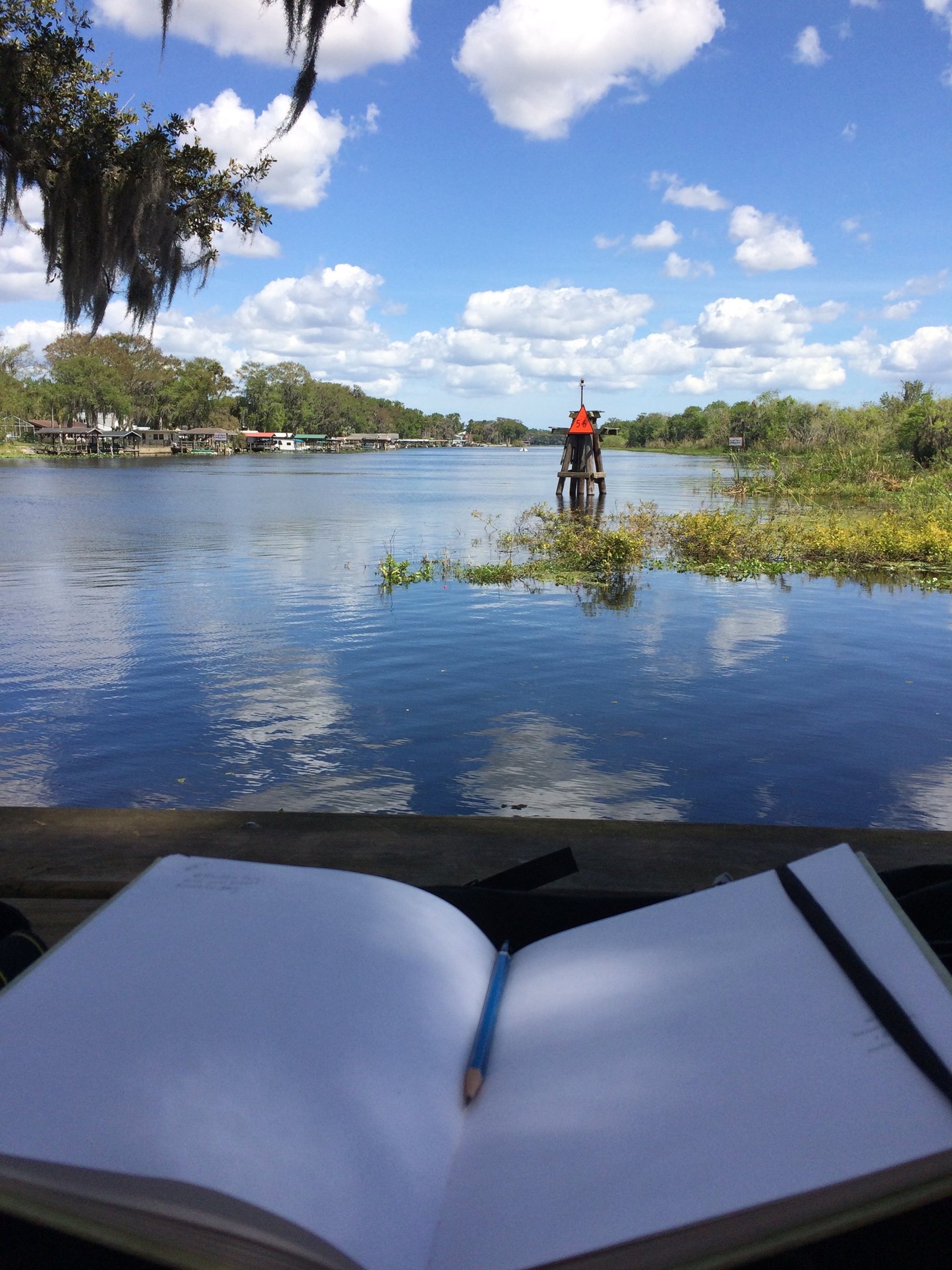 I guess that I come prepared. I've been seen carrying my handy stool out and about at nature parks. Luckily, on this one day while on location with my sketching group at Hontoon Island State Park a lot of pinecones were laying around. Putting them in to the right still life was another matter on the slope of the river bank.