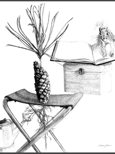 Most of my life my personal and spiritual connection to pine trees had been growing. Lately, I'd read about how important forests are for storing carbon. I'd been trying to come up with a composition called, Plant More Trees. At last, it all came together! The stool was the ground separating the roots from the seed and stem. I used all my sketches to assemble the composition. The squirrel is on my sketchbook waiting for some yummy pine nuts and doing its part in the ecosystem. And , of course, the pine tree forest shares its wealth with the whole planet by storing carbon.